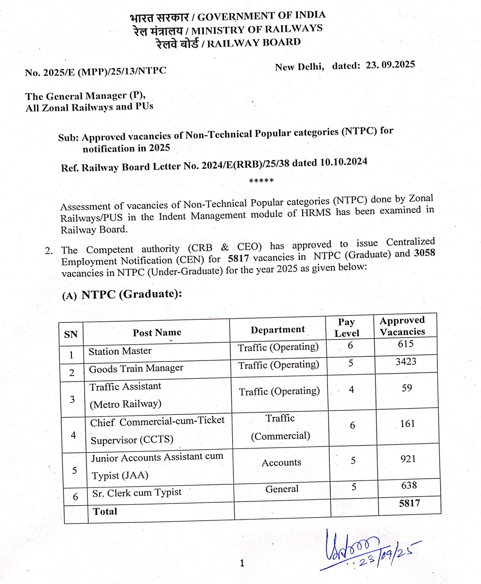 According to the RRB NTPC Vacancy 2025 Draft released on September 23, 2025, a total of 8,875 vacancies will be recruited this year, comprising 5,817 for graduate-level posts and 3,058 for undergraduate-level posts. Candidates can check the post-wise vacancies announced for various  Non-Technical Popular Categories. The post-wise vacancy details are attached below.